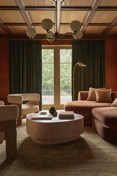 No living room is complete without the right sofa. In the Quiet Contrast design, the Lulu and Georgia sofa is the anchor piece, offering plush comfort with a sculptural silhouette. Its rounded edges soften the room while its saturated fabric introduces richness and warmth.